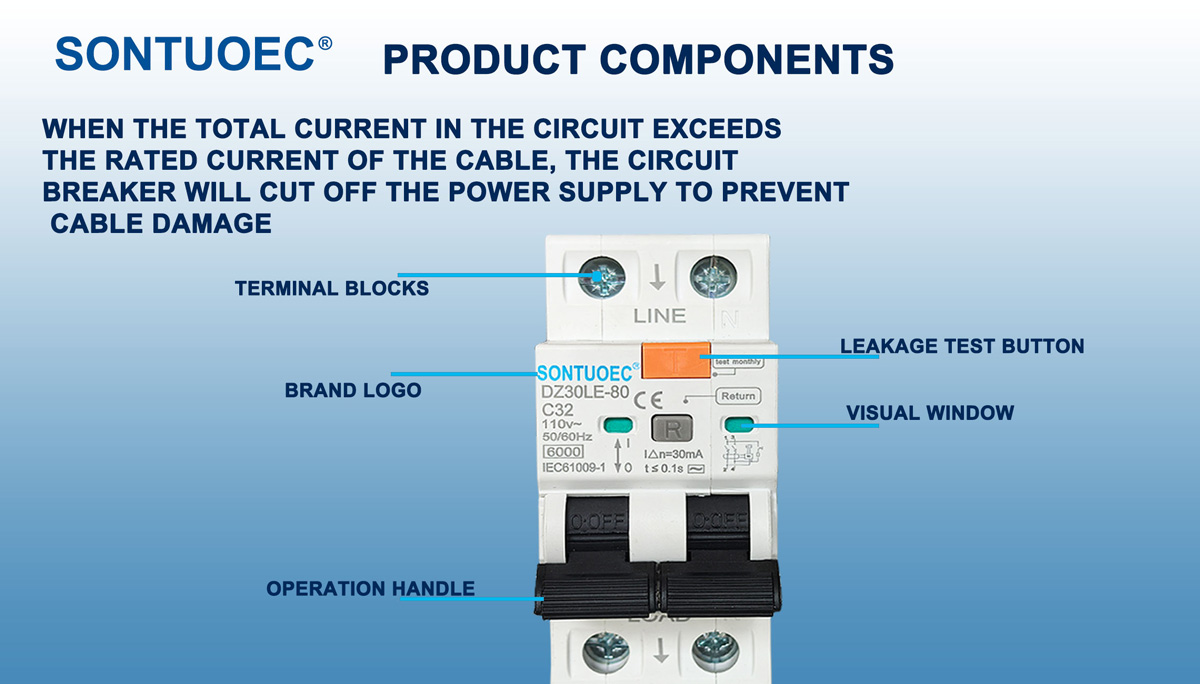 කාන්දුවීම් ආරක්ෂාව: DZ30LE-80 පරිපථයක ඉතිරිකිරීමේ ධාරාව (I., කාන්දුවීම් ධාරාව) හඳුනා ගැනීමට හැකියාව ඇත. අවශේෂ ධාරාව කට්ටලය කට්ටලය ඉක්මවා යන විට, විද්යුත් අවතාර අනතුරු හා විදුලි ගිනි වැළැක්වීම සඳහා ඉතා කෙටි කාලයක් තුළ DZ30LE-80 RCBO ඉතා කෙටි කාලයක් තුළ පරිපථය කපා දමනු ඇත.